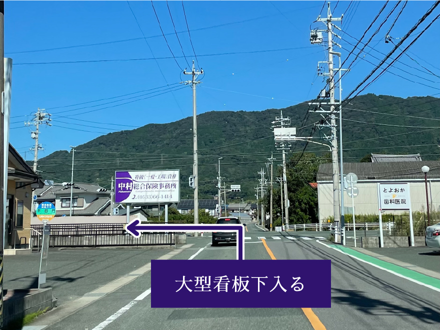 「豊岡平田門」信号手前の大型看板下よりお入りください。